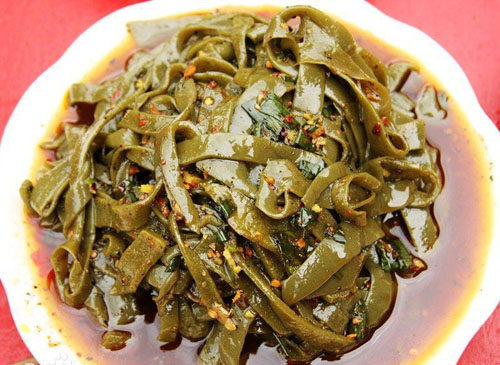 说到洋县华阳的美食,这里的土生土长的人们会给你带来另外一种惊喜,一个属于大自然的馈赠。古时,当地人用一种名叫“神仙树”的植物茎叶加工制作的特色食物----“神仙豆腐”。这种“神仙树”学名“双翅六道木”属于忍冬科六道木属的灌木类植物。将其茎叶手搓或捣成糊状,加适量水,搅匀之后用荷叶盖住,放置阴凉处10-20分钟即成。“神仙豆腐”使用天然植物作为原材料,做法质朴简单,无任何添加,质感滑溜,入口清凉,味道微苦,通常切成细丝状,佐以食醋、辣椒油等香辛料拌匀。味道麻辣酸香,轻快爽口,可谓“只品神仙,不见豆腐!”。“神仙豆腐”原本属于南方广西、湖南一带的常备食物,因华阳所处独特的地理位置环境和历史变迁,“神仙豆腐”就在此安家落户。